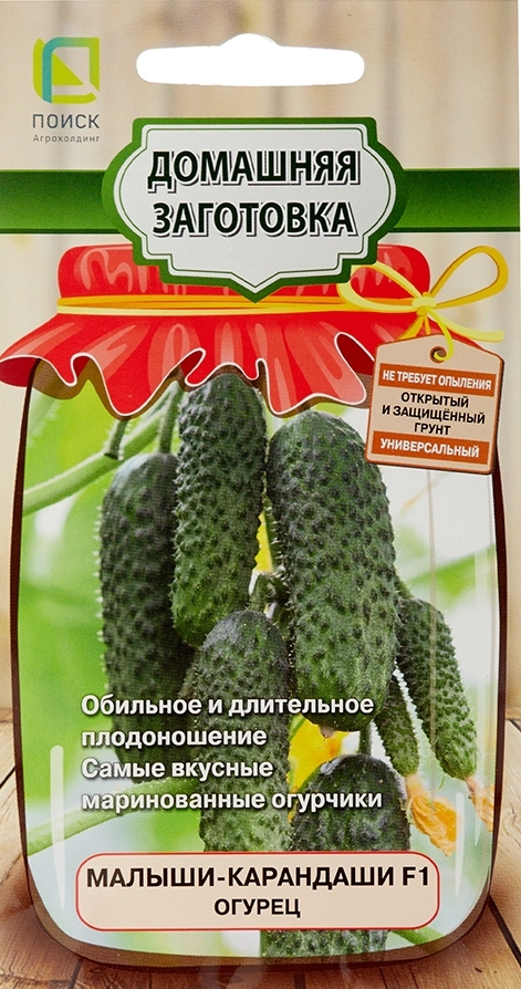Огурец Малыши-карандаши F1 - партенокарпический гибрид для защищенного и открытого грунта. От всходов до плодоношения 38-42 дня. Число завязей в узле 2-3. Плоды крупнобугорчатые, темно-зеленой окраски, белошипые цилиндрической формы, без горечи, длиной 12-14 см. Масса 120-150 г. Не снижает интенсивности плодоношения при перепадах дневных и ночных температур. Устойчив к кладоспориозу, вирусу огуречной мозаики, мучнистой росе и относительно устойчив к пероноспорозу. Рекомендуется для маринования.